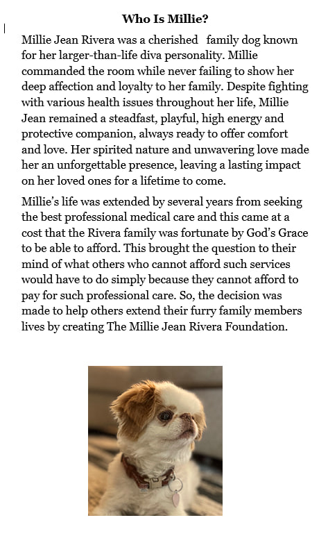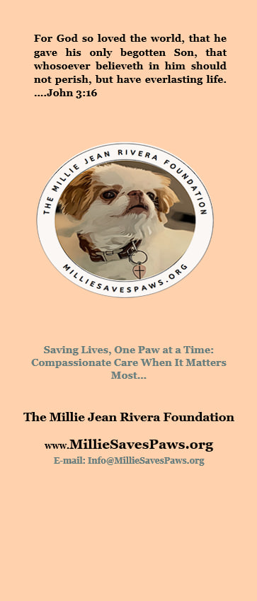 The Millie Jean Rivera Foundation is dedicated to the charitable and educational purpose of spreading God’s word and providing financial support for pet care, specifically for medications and surgeries that extend the lives of pets. We believe that faith and animal welfare are connected through stewardship, compassion, and care for all of God’s creation.